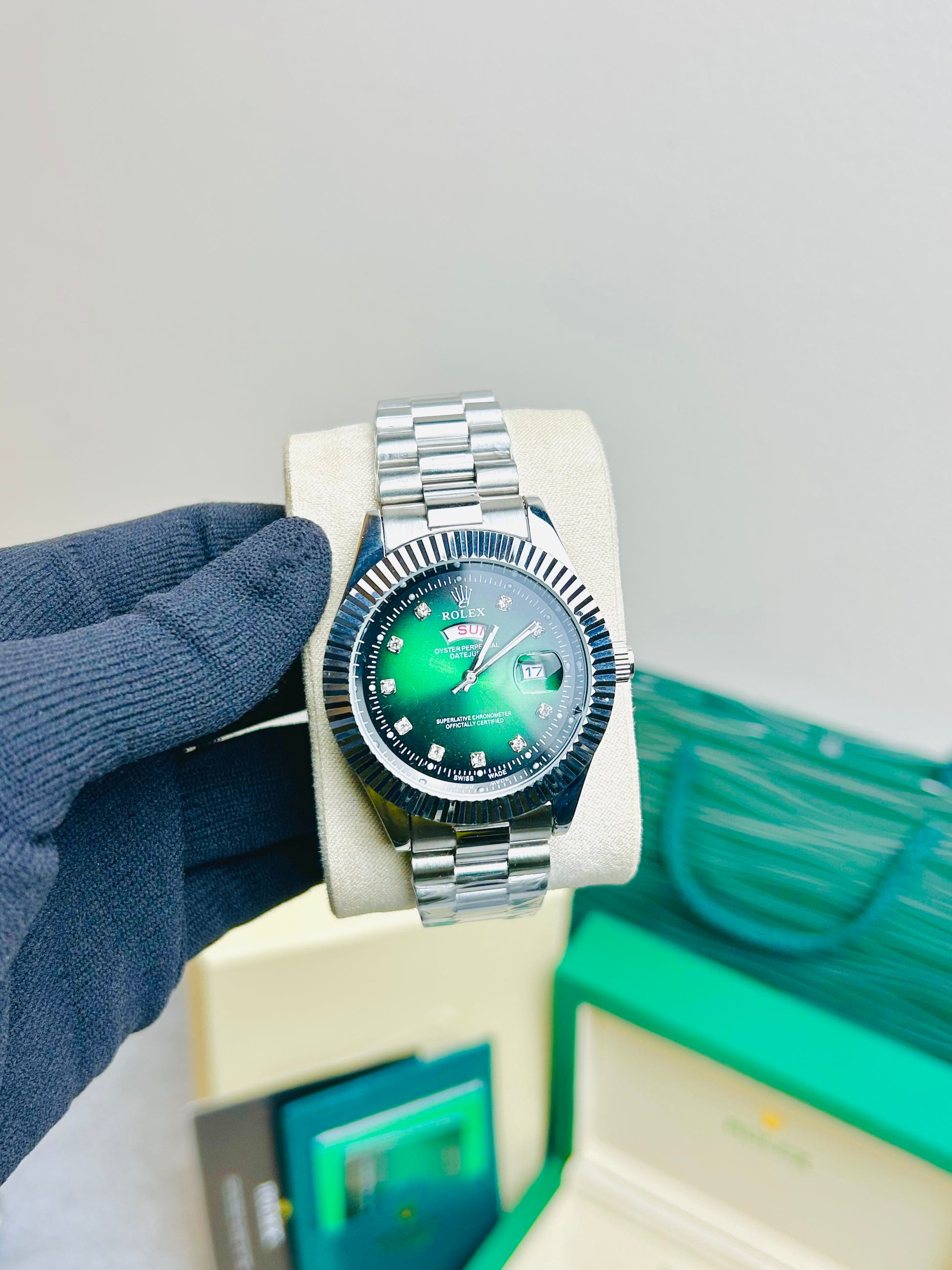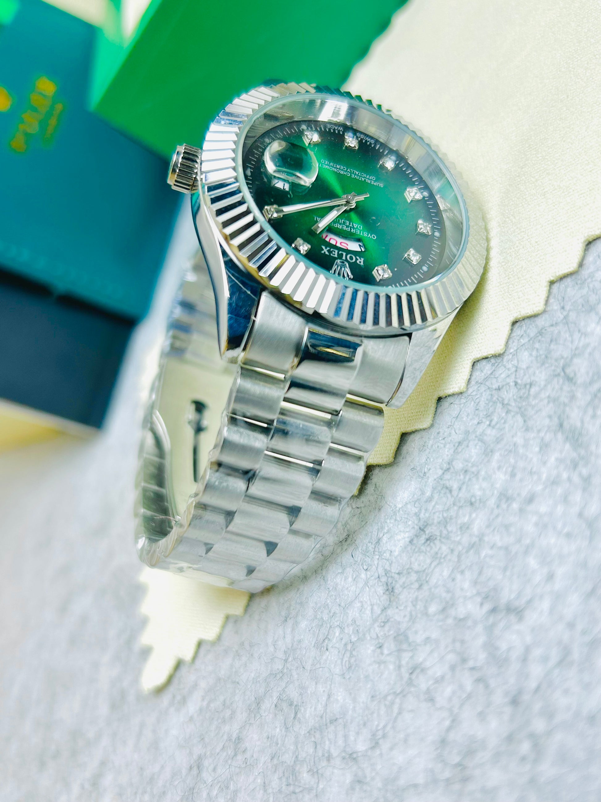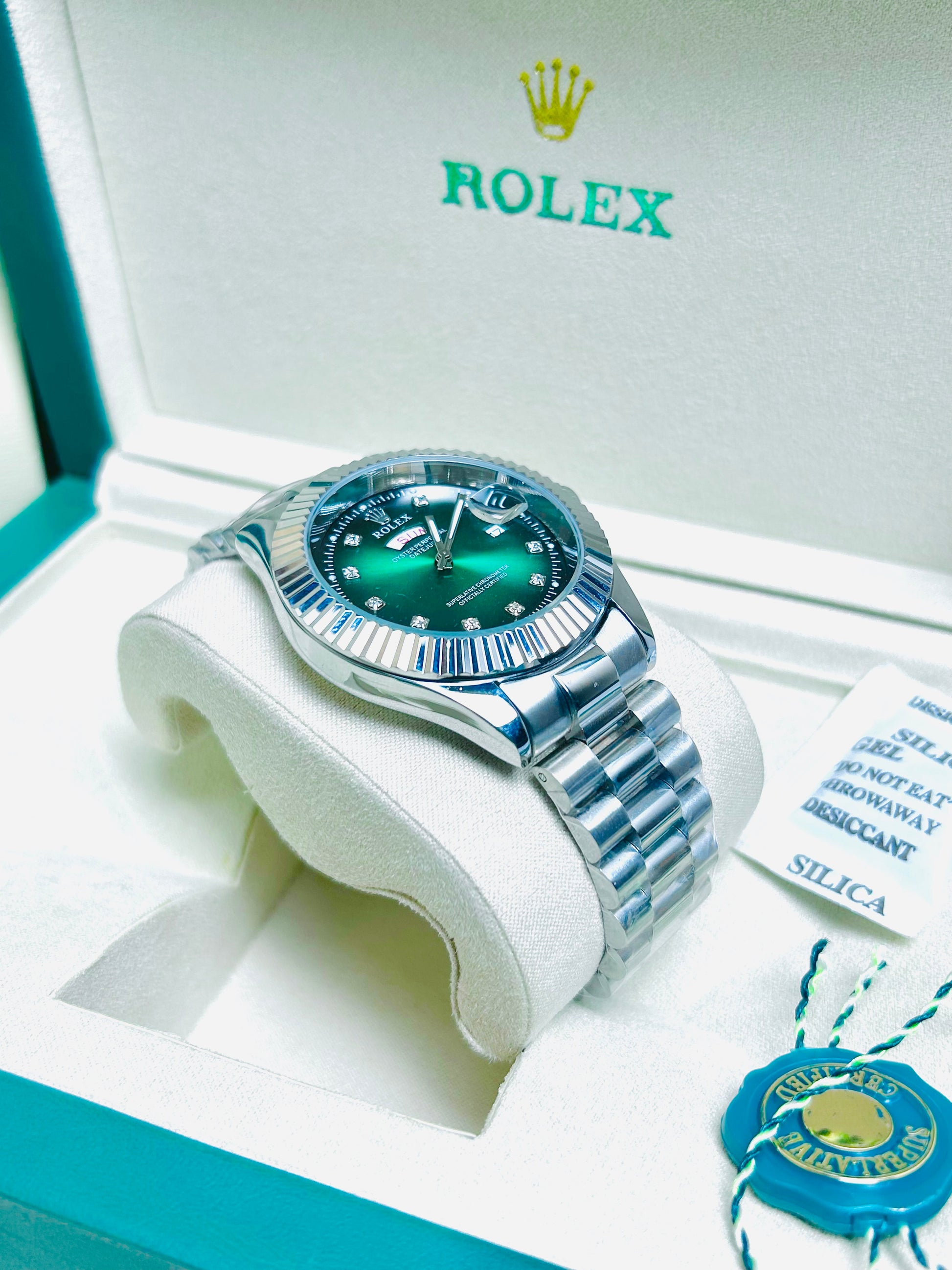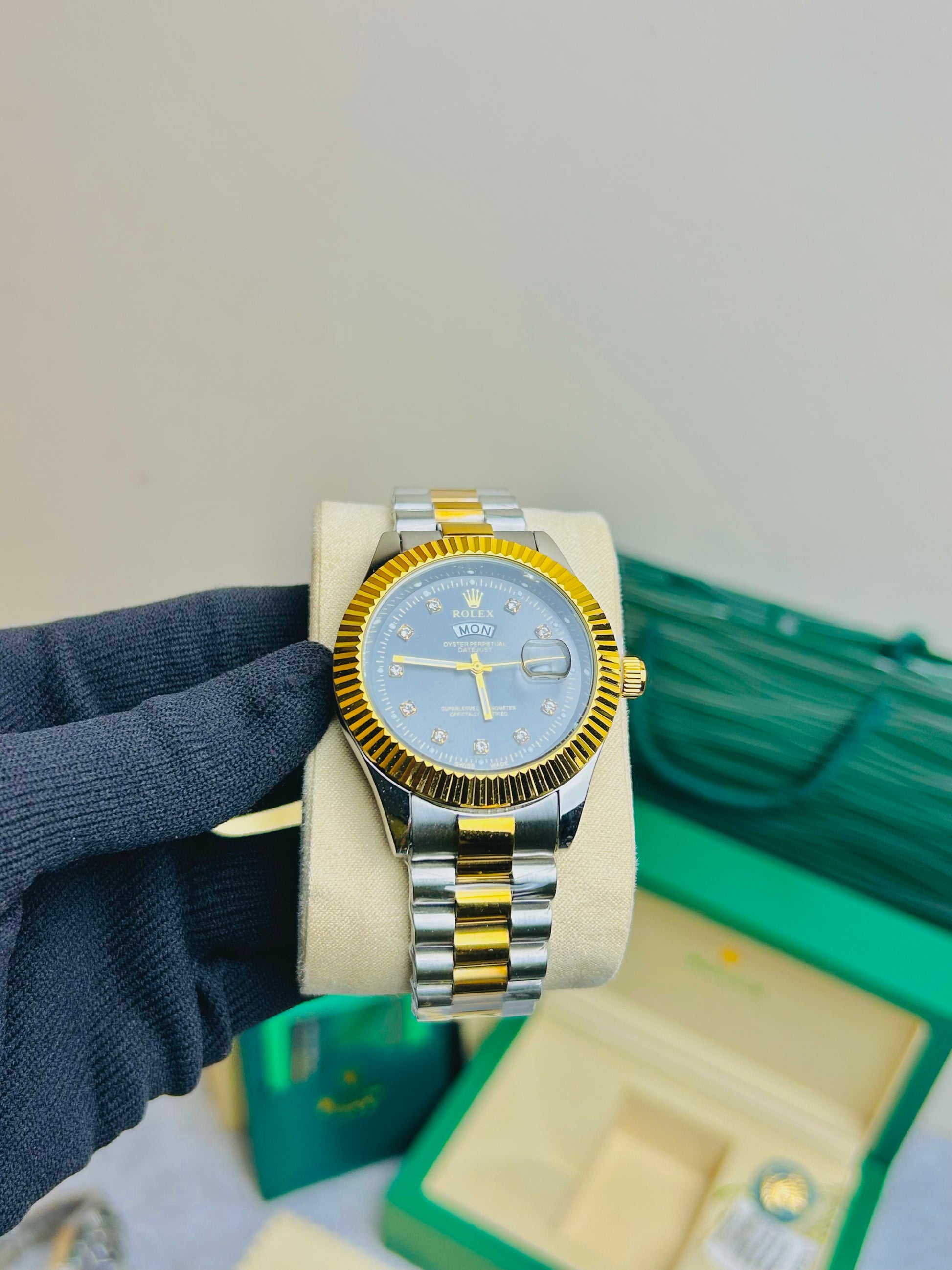 Blue Dial Luxury Watch with Silver Chain & Original Rolex Box