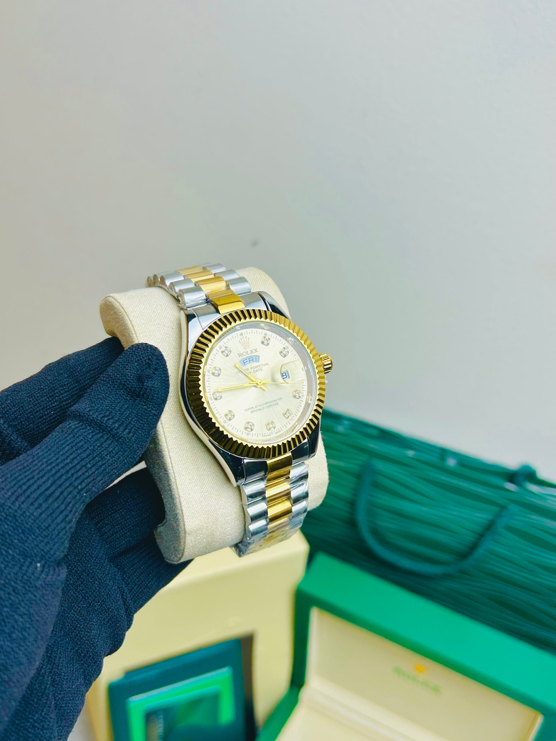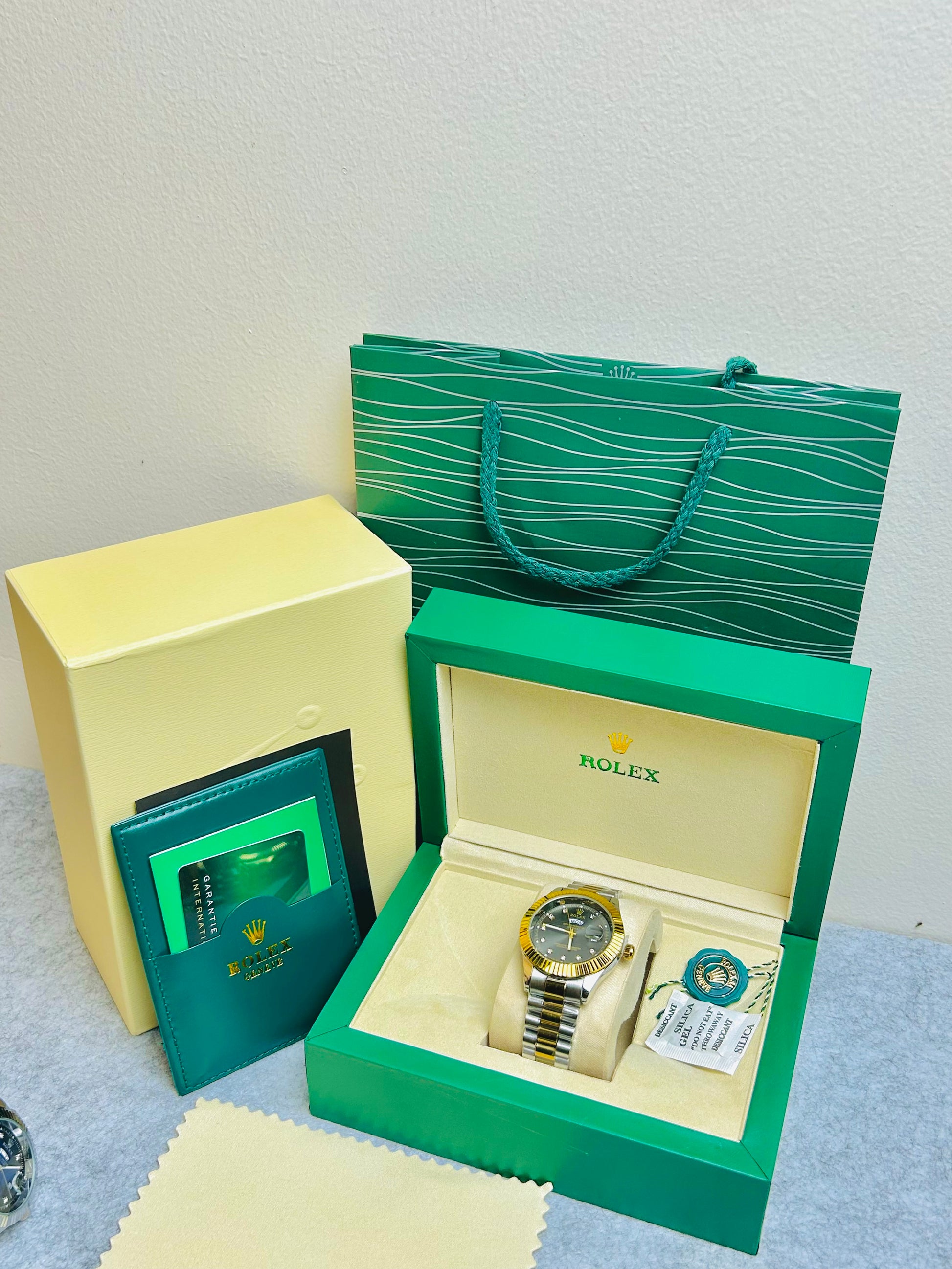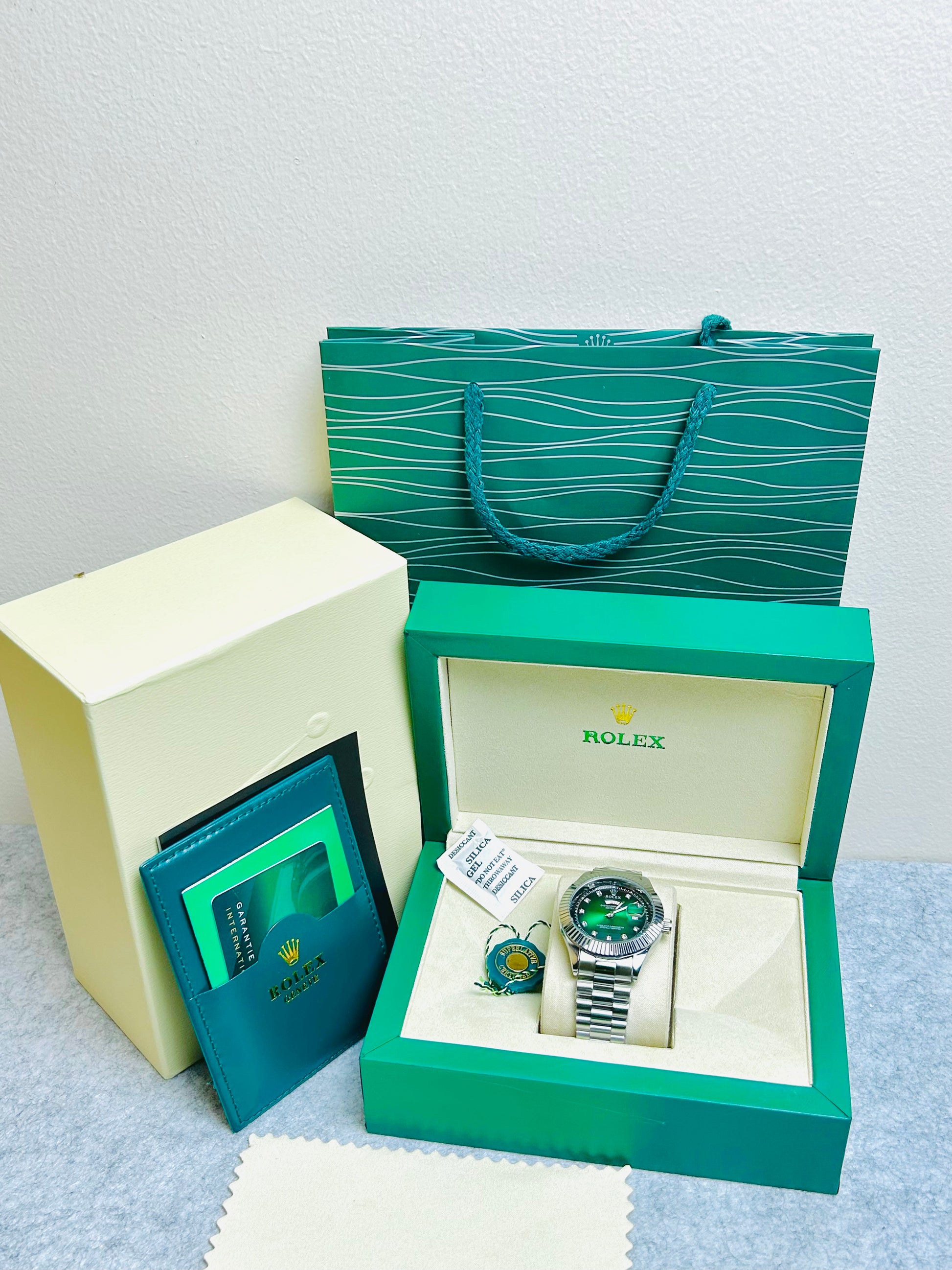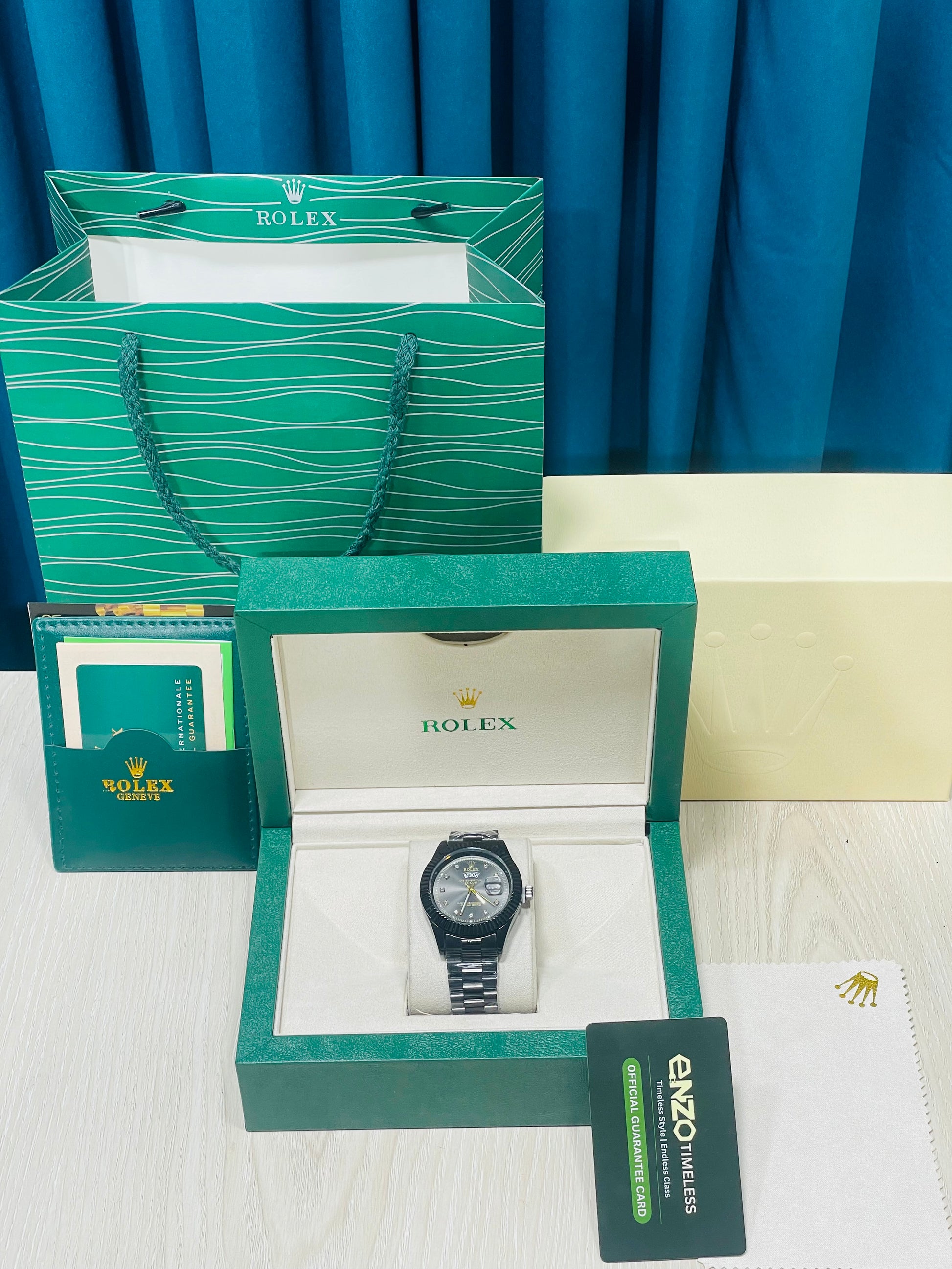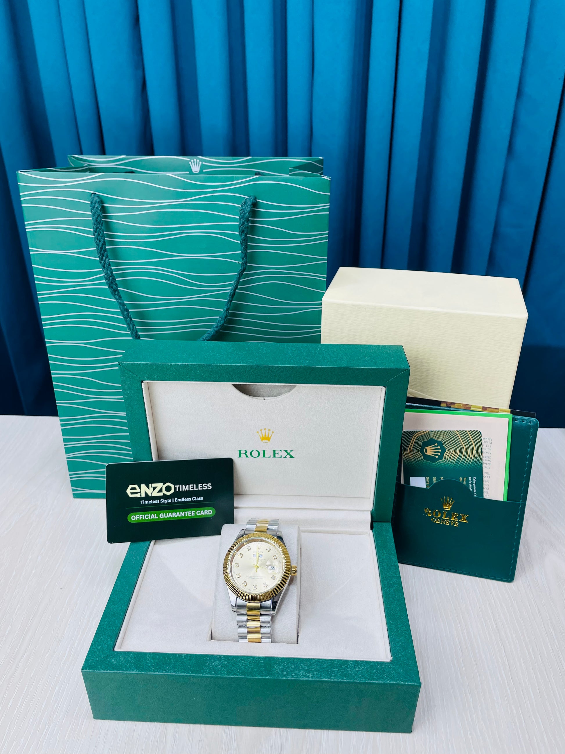 Blue Dial Luxury Watch with Silver Chain & Original Rolex Box