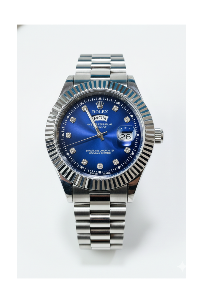 Bring elegance to your wrist with this Blue Dial Luxury Watch, paired with a stylish silver chain strap. Crafted with premium metal, scratch-resistant mineral glass, and smooth mechanical movement, this watch delivers both durability and sophistication. Comes with an Original Rolex Box, perfect for gifting or personal style.