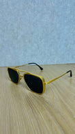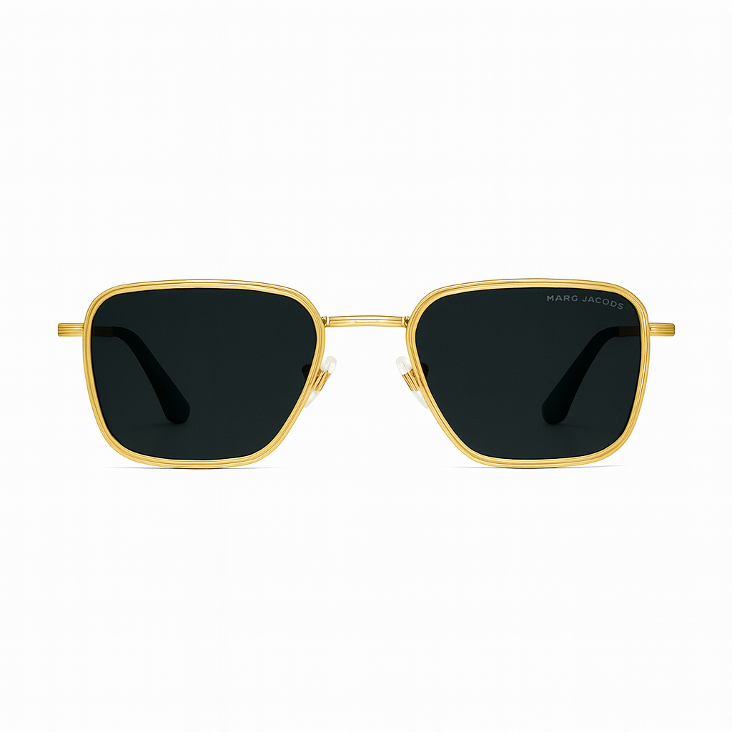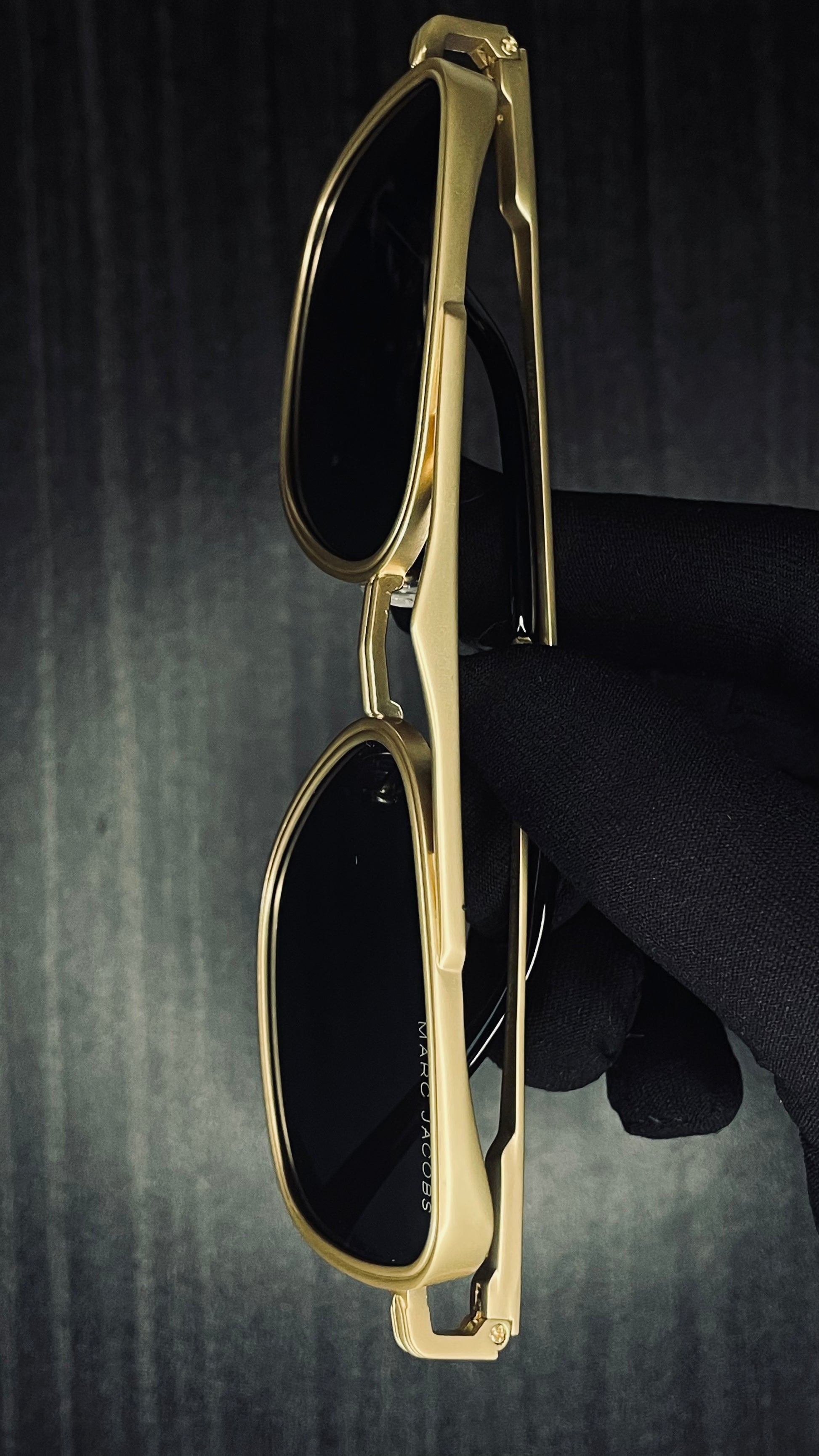 Modern sunglass with a strong black frame and golden temples. Designed for ultimate luxury.