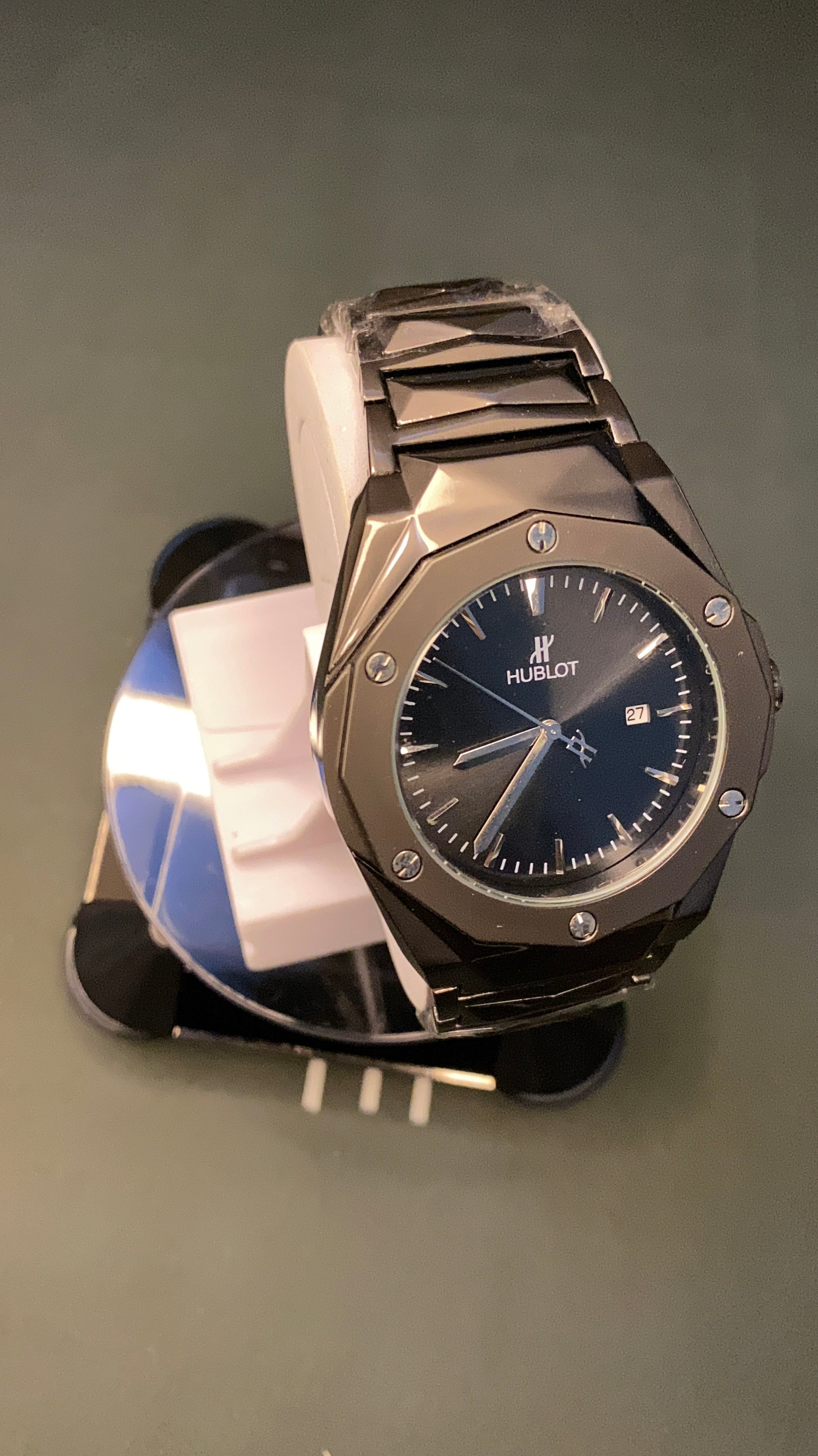 Matte black design with ghost markers, stealth luxury.